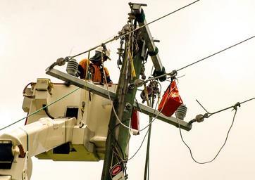 Keywords: workers men linesmen electricity repair pole cherry picker wires cables energy