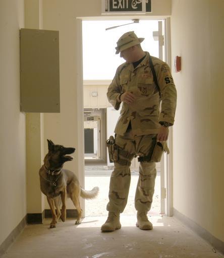 Keywords: Working Dogs Get Training DVIDS25737.jpg en SOUTHWEST ASIA -- Rocky a three-year-old Belgian Malinois and his handler Staff Sgt Keith Cook of the military working dog flight go through explosive ordnance detection training here July 13 Their are four dogs and 10 handlers in the flight Sergeant Cook is deployed from Goodfellow Air Force Base Texas 2006-07-13 https //www dvidshub net/image/25737 25737 2006-07-14 10 33 PD-USGov Goodfellow Air Force Base Images from DoD uploaded by Fæ |