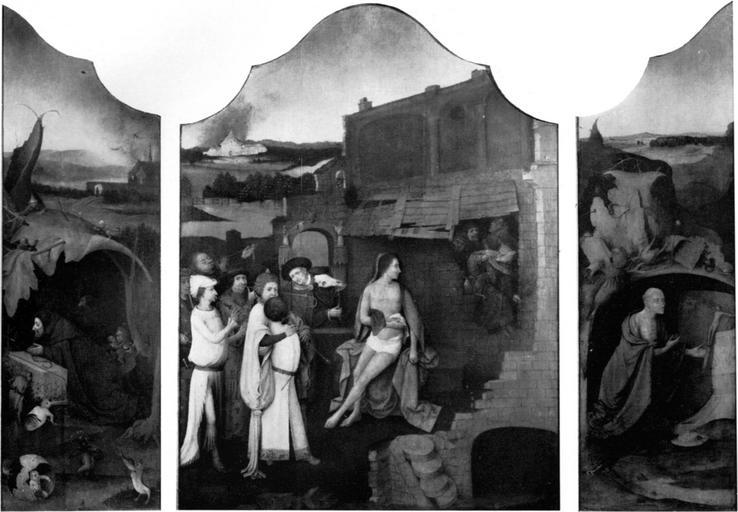 Keywords: Workshop of Jheronimus Bosch 003 interior.jpg workshop of i18n/or follower of Title Job Triptych Job-triptiek Alternate titles LangSwitch The Story of Job <ref>Koldeweij Vandenbroeck and Vermet 2001; ISBN 0-8109-6735-9 p 88 </ref> De bevroeving van Job - De bekoring van de H Antonius - De penitentie van de H Hiëronymus <ref>De Tolnay 1986; ISBN 9061131642 p 567 </ref> ~ 1507-1515 oil oak panel cm 98 3 132 8 Institution Groeningemuseum Object history by 1858 St-Jacob-de-Meerdere-kerk Hoeke ProvenanceEvent 1931 loan LangSwitch das the au het Groeningemuseum Brugge St-Jacob-de-Meerdere-kerk Hoeke Max J Friedländer 1969 Early Netherlandisch Painting Volume V Geertgen tot Sint Jans and Jerome Bosch Leyden A W Slijthof Brussels La Connaissance cat no Add 136 plate 118 top 0 209 Other versions Workshop of Jheronimus Bosch 003 exterior jpg Exterior Exhibition history black and white image 59 Drieluik met Job Antonius en Hiëronymus Size cm 98 3 72 1 LangSwitch central panel middenpaneel cm 98 1 30 5 and cm 97 8 30 2 LangSwitch wings zijluiken inv 209 Anonymous 56794 name Workshop of LangSwitch Hieronymus Jheronimus Bosch / LangSwitch Hieronymus Jheronimus Bosch De H Antonius links ; De beproevingen van Job midden ; De H Hieronymus rechts ~ 1507 LangSwitch or later of later 1505-1515 cm 98 3 72 1 LangSwitch central panel middenpaneel cm 98 1 30 5 LangSwitch right wing rechterluik cm 97 8 30 2 LangSwitch left wing linkerluik inv 0 209 Anonymous 92786 Follower of LangSwitch Hieronymus Jheronimus Bosch Job-triptiek ~ 1507 1526- ~ 1600 cm 98 3 132 8 cm 98 3 72 1 LangSwitch central panel middenpaneel cm 98 1 30 5 LangSwitch left wing linkerluik cm 97 8 30 2 LangSwitch right wing rechterluik ˜In a very poor state of preservation almost entirely overpainted ™ Workshop of LangSwitch Hieronymus Jheronimus Bosch / LangSwitch Hieronymus Jheronimus Bosch Job getroost door de muzikanten geopend Antonius Job getroost door de muzikanten Hieronymus ~ 1507 LangSwitch or later of later cm 98 3 132 5 color image PD-old-100 LangSwitch References Noten <references /> ImageNote 1 662 497 376 515 1634 1134 2 299px ImageNoteEnd 1 ImageNote 2 1283 597 300 394 1634 1134 2 299px<br /> File Workshop of Jheronimus Bosch 003 right inner wing 02 detail 01 jpg ImageNoteEnd 2 Job Triptych workshop of Hieronymus Bosch 01 Paintings after Hieronymus Bosch Jerome01