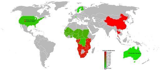 | Keywords: World map of lactose intolerance.png Lactose Intolerance by region of the world African countries are only a rough guess http //en wikipedia org/wiki/Image LacIntol-World png 2006-09-02 http //en wikipedia org/wiki/User Nbound Gastroenterology Lactose intolerance Allele genotype or phenotype frequency maps human |