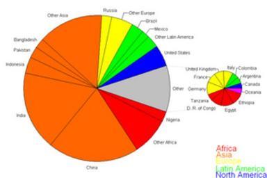 | Keywords: World population pie chart.PNG diagram year/source of data Global population distribution by region Colours indicate broad regions while smaller divisions within these colours indicate subregions Other North America refers to Greenland and St Pierre Miquelon The division between Western and Eastern Europe follows the old Iron Curtain line except that Greece is delegated to Eastern Europe Iceland and Finland are included in Scandinavia Arab West Asia includes Cyprus Mauritania and Sudan are included in North Africa while Niger is included in West Africa and Chad is included as Central Africa Rwanda Burundi are included as East Africa Southern Africa is Angola Zambia and Mozambique south Central Asia includes Afghanistan Nepal Bhutan and Mongolia Own graph made with Excel details added with Paint 2008-03 Brutannica World population statistics |