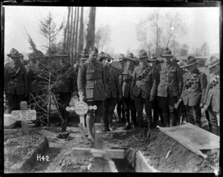 | Keywords: blackandwhite monochrome photo border outdoor black and white World War I soldiers at the burial of Sapper J F Haynes of New Zealand Engineers, at or near Romarin, France, circa 6 May 1917. Shows men around the grave which is alongside that of Cpl F T Morris. One of the men plays (the Last Post?) on a bugle. Photograph taken 1917 by Henry Armytage Sanders. Inscriptions: Inscribed - Photographer's title on negative -bottom left: H42. Quantity: 1 b&w original negative(s). Physical Description: Dry plate glass negative 4 x 5 inches New Zealand. Army. NZEF. New Zealand Engineers. World War I New Zealand soldiers at the burial of Sapper J F Haynes, Romarin, France. Royal New Zealand Returned and Services' Association :New Zealand official negatives, World War 1914-1918. Ref: 1/2-012759-G. Alexander Turnbull Library, Wellington, New Zealand. natlib.govt.nz/records/22769260 World War I soldiers at the burial of Sapper J F Haynes of New Zealand Engineers, at or near Romarin, France, circa 6 May 1917. Shows men around the grave which is alongside that of Cpl F T Morris. One of the men plays (the Last Post?) on a bugle. Photograph taken 1917 by Henry Armytage Sanders. Inscriptions: Inscribed - Photographer's title on negative -bottom left: H42. Quantity: 1 b&w original negative(s). Physical Description: Dry plate glass negative 4 x 5 inches New Zealand. Army. NZEF. New Zealand Engineers. World War I New Zealand soldiers at the burial of Sapper J F Haynes, Romarin, France. Royal New Zealand Returned and Services' Association :New Zealand official negatives, World War 1914-1918. Ref: 1/2-012759-G. Alexander Turnbull Library, Wellington, New Zealand. natlib.govt.nz/records/22769260 |