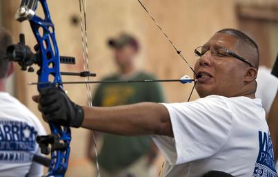 | Keywords: Wounded Warrior Pacific Trials 121114-N-WF272-043.jpg en Retired Boatswain's Mate 1st Class Jim Castaneda wounded warrior draws a bow with his mouth during archery practice during the Wounded Warrior Pacific Trials Castaneda suffered a heart stroke and is unable to use the right side of his body Wounded ill and injured sailors and Coast Guardsman from across the country are going head-to-head in archery cycling track and field shooting sitting volleyball swimming and wheelchair basketball for one of 35 places on the 2013 Warrior Games Navy-Coast Guard team U S Navy photo by Mass Communication Specialist Seaman Diana Quinlan 2012-11-14 Petty Officer 3rd Class Diana Quinlan https //www dvidshub net/image/785027 121114-N-WF272-043 2012-11-17 07 22 JOINT BASE PEARL HARBOR-HICKAM HI US PD-USGov-Military-Navy 2012 in Pearl Harbor Sports at Pearl Harbor Archery in the United States Wounded Warrior 2012 Images from DoD uploaded by Fæ |