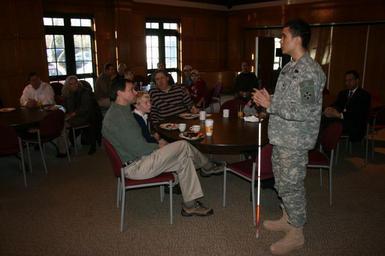 | Keywords: Wounded Warrior Speaks to Chicagoland Citizens DVIDS157640.jpg en Spc Steven Baskis an infantryman assigned to Bravo Company a Warrior Transition Unit in Fort Knox Ky spoke to more than 35 members of the Grace Episcopal Church at a breakfast in Hindale Ill Saturday March 14 about his service in Baghdad Iraq The 23-year-old from Rantoul Ill who served on the personal security detachment for Brig Gen Mike Milano deputy commanding general Multi-National Division Baghdad lost his sight while conducting combat operations when an electronically formed projectile exploded near his vehicle in May 2008 He told the audience the only thing that I miss about seeing is facial expressions An admitted world traveler Baskis said despite being a young man he has seen a lot in 23 years and doesn't regret or feel disappointed about losing his vision because there are other wounded Warriors who have lost more than him After the attack Baskis was treated at a military treatment facility in Iraq for shrapnel wounds to his eyes upper and lower extremities; head and neck and later medically evacuated to Walter Reed Army Medical Center He is undergoing rehabilitation at the Edward Hines Jr VA Hospital in Chicago 2009-03-14 Master Sgt Sheldrick McNeal https //www dvidshub net/image/157640 157640 2009-03-16 18 32 CHICAGO IL US PD-USGov Fort Knox Images from DoD uploaded by Fæ |