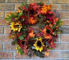 Keywords: wreath autumn leaves fall orange red wall brick hanging decorative thanksgiving october november ornament festive decoration seasonal