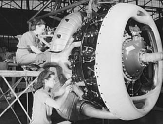 | Keywords: Wright R-2600 engine for A-31 bomber at Vultee Nashville 1943.jpg Two women employees at the Nashville Division of Vultee Aircraft Inc are shown installing the exhaust-collector ring on a Wright R-2600-A5B-5 Twin Cyclone 14 cylinder radial air-cooled engine which will go into a Vultee A-31 Vengeance dive bomber LOC-image fsa 8b06369 1943-02 Alfred T Palmer frame removed PD-USGov Wright R-2600 Vultee A-31 Vengeance Photographs by Alfred T Palmer | ||||