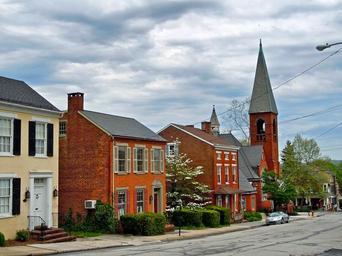 Keywords: wrightsville pennsylvania town church buildings architecture street skyline scenic trees sky clouds houses spring outside