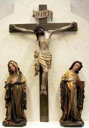 | Keywords: Wrocław Dumlose Crucifixion.jpg Wrocław ca 1410 polychromy gilt wood cm 104 5 98 26 Figure of Christ <br> cm 172 100 9 3 3 Cross <br> cm 85 31 20 5 Sorrowful Virgin <br> cm 85 5 31 5 22 St John the Evangelist Institution National Museum Warsaw 0 accession number Śr 6/a-c object history ca 1410 transfer Dumlose Family Chapel St Elizabeth's Church Wrocław ProvenanceEvent 1946 transfer National Museum in Warsaw credit line Lech Majewski 2008 Mystic Middle Ages Bosz cat no 20a b p 20 own BurgererSF See below Cc-zero DEFAULTSORT 1410 circa; Dumlose Crucifixion 15th-century sculptures in the National Museum in Warsaw Medieval sculptures in the National Museum in Warsaw Silesian sculptures in the National Museum in Warsaw Sculptures formerly in the St Elizabeth's Church in Wrocław Sculptures of Crucifixion group in Poland |