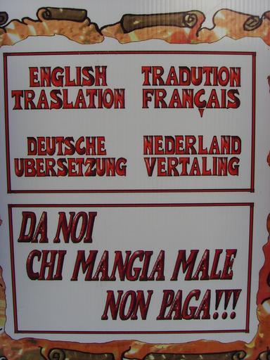Keywords: Wrong translations.jpg en Sign in a restaurant in an Italian village with a mistake in every translation English traslation †’ English translation Tradution français †’ Traduction française Deutsche ubersetzung †’ Deutsche à bersetzung Nederland vertaling †’ Nederlandse vertaling The text underneath says that one doesn't have to pay if the food isn't okay own Luctor 2008-08-19 Language Humor signs Multilingual signs in Italy Grammar mistakes |