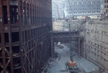 | Keywords: WTC bathtub east.JPG en 1969 view of the original WTC bathtub looking northeast The frame of the south tower is on the left PATH eastbound tunnel F can be seen in the center penetrating the slurry wall on its way up Cortlandt Street to Hudson Terminal Remnants of this tunnel can still be seen today The slurry wall runs along the west side of Greenwich Street The IRT subway tunnel runs below the street behind the slurry wall own Usrlman 1969 Slurry wall Tiebacks Construction of the Twin Towers New York City The Bathtub Scanned with Canon CanoScan 8400F |