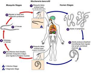 | Keywords: Wucheria bancrofti LifeCycle.gif Wuchereria bancrofti Life cycle of Wuchereria bancrofti Different species of the following genera of mosquitoes are vectors of W bancrofti filariasis depending on geographical distribution Among them are Culex C annulirostris C bitaeniorhynchus C quinquefasciatus and C pipiens ; Anopheles A arabinensis A bancroftii A farauti A funestus A gambiae A koliensis A melas A merus A punctulatus and A wellcomei ; Aedes A aegypti A aquasalis A bellator A cooki A darlingi A kochi A polynesiensis A pseudoscutellaris A rotumae A scapularis and A vigilax ; Mansonia M pseudotitillans M uniformis ; Coquillettidia C juxtamansonia During a blood meal an infected mosquito introduces third-stage filarial larvae onto the skin of the human host where they penetrate into the bite wound They develop in adults that commonly reside in the lymphatics The female worms measure 80 to 100 mm in length and 0 24 to 0 30 mm in diameter while the males measure about 40 mm by 1 mm Adults produce microfilariae measuring 244 to 296 μm by 7 5 to 10 μm which are sheathed and have nocturnal periodicity except the South Pacific microfilariae which have the absence of marked periodicity The microfilariae migrate into lymph and blood channels moving actively through lymph and blood A mosquito ingests the microfilariae during a blood meal After ingestion the microfilariae lose their sheaths and some of them work their way through the wall of the proventriculus and cardiac portion of the mosquito's midgut and reach the thoracic muscles There the microfilariae develop into first-stage larvae and subsequently into third-stage infective larvae The third-stage infective larvae migrate through the hemocoel to the mosquito's prosbocis and can infect another human when the mosquito takes a blood meal http //www dpd cdc gov/dpdx/images/ParasiteImages/A-F/Filariasis/W_bancrofti_LifeCycle gif PD-USGov Filariasis Wuchereria bancrofti CDC lifecycles Parasitic life cycles of nematodes |