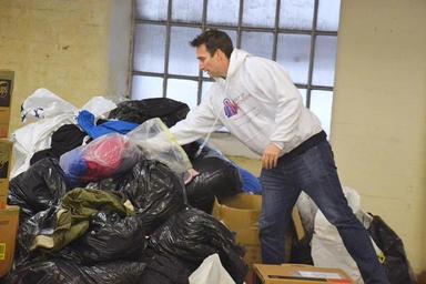 Keywords: Cllr John Leech sorting through mountain of donated coats.