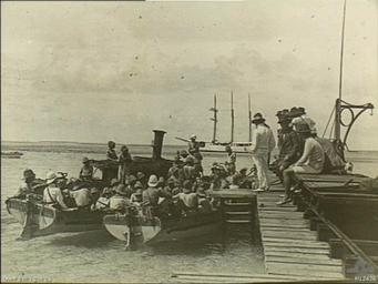 | Keywords: WW1 Landing at Direction Island.jpg en A landing party from the German Navy cruiser Emden leaving the jetty of Direction Island Cocos Keeling Islands in the Indian Ocean jetty on 9 November 1914 during World War I In the background is Ayesha the vessel with which they repaired and then sailed without a chart to Padang Sumatra The German landing party eventually made their way back by ship overland and train to Constantinople now Istanbul and on to Germany H12436 Donated to the Australian War Memorial collections by the Imperial War Museum where it is listed as item Q22706 1914-11- 2009022310000623 Only to be used with link to http //cas awm gov au/photograph/H12436 PD-old Indian Ocean theatre of World War I Cocos Keeling Islands |