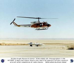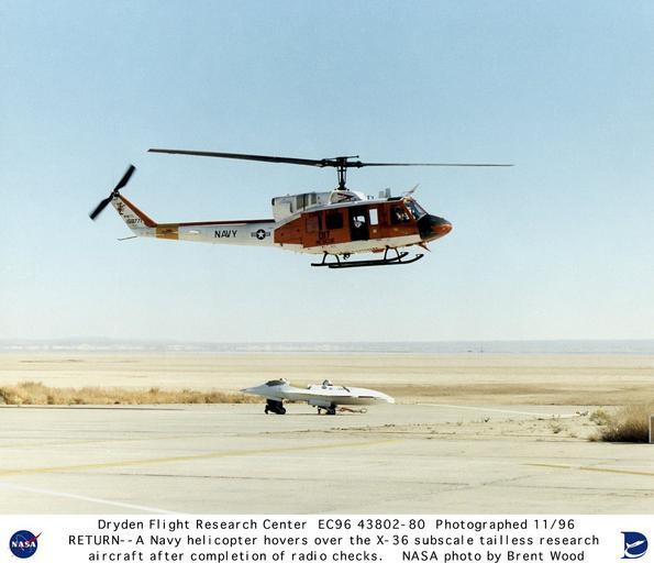 | Keywords: X-36 on Ground after Radio and Telemetry Tests DVIDS684937.jpg en A UH-1 helicopter lowers the X-36 Tailless Fighter Agility Research Aircraft to the ground after radio frequency and telemetry tests above Rogers Dry Lake at NASA Dryden Flight Research Center Edwards California in November 1996 The purpose of taking the X-36 aloft for the radio and telemetry system checkouts was to test the systems more realistically while airborne More taxi and radio frequency tests were conducted before the aircraft's first flight in early 1997 The NASA/Boeing X-36 Tailless Fighter Agility Research Aircraft program successfully demonstrated the tailless fighter design using advanced technologies to improve the maneuverability and survivability of possible future fighter aircraft The program met or exceeded all project goals For 31 flights during 1997 at the Dryden Flight Research Center Edwards California the project team examined the aircraft's agility at low speed / high angles of attack and at high speed / low angles of attack The aircraft's speed envelope reached up to 206 knots 234 mph This aircraft was very stable and maneuverable It handled very well The X-36 vehicle was designed to fly without the traditional tail surfaces common on most aircraft Instead a canard forward of the wing was used as well as split ailerons and an advanced thrust-vectoring nozzle for directional control The X-36 was unstable in both pitch and yaw axes so an advanced single-channel digital fly-by-wire control system developed with some commercially available components was put in place to stabilize the aircraft Using a video camera mounted in the nose of the aircraft and an onboard microphone the X-36 was remotely controlled by a pilot in a ground station virtual cockpit A standard fighter-type head-up display HUD and a moving-map representation of the vehicle's position within the range in which it flew provided excellent situational awareness for the pilot This pilot-in-the-loop approach eliminated the need for expensive and complex autonomous flight control systems and the risks associated with their inability to deal with unknown or unforeseen phenomena in flight Fully fueled the X-36 prototype weighed approximately 1 250 pounds It was 19 feet long and three feet high with a wingspan of just over 10 feet A Williams International F112 turbofan engine provided close to 700 pounds of thrust A typical research flight lasted 35 to 45 minutes from takeoff to touchdown A total of 31 successful research flights were flown from May 17 1997 to November 12 1997 amassing 15 hours and 38 minutes of flight time The aircraft reached an altitude of 20 200 feet and a maximum angle of attack of 40 degrees In a follow-on effort the Air Force Research Laboratory AFRL Wright-Patterson Air Force Base Ohio contracted with Boeing to fly AFRL's Reconfigurable Control for Tailless Fighter Aircraft RESTORE software as a demonstration of the adaptability of the neural-net algorithm to compensate for in-flight damage or malfunction of effectors such as flaps ailerons and rudders Two RESTORE research flights were flown in December 1998 proving the viability of the software approach The X-36 aircraft flown at the Dryden Flight Research Center in 1997 was a 28-percent scale representation of a theoretical advanced fighter aircraft The Boeing Phantom Works formerly McDonnell Douglas in St Louis Missouri built two of the vehicles in a cooperative agreement with the Ames Research Center Moffett Field California NASA Identifier NIX-EC96-43802-80 2009-09-23 Glenn Research Center https //www dvidshub net/image/684937 684937 2012-10-10 11 06 WASHINGTON DC US PD-USGov Aircraft at Rogers Dry Lake McDonnell Douglas X-36 Images from DoD uploaded by Fæ Bell UH-1N Twin Huey |