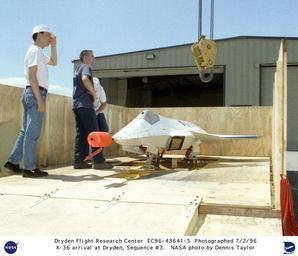 | Keywords: X-36 Tailless Fighter Agility Research Aircraft arrival at Dryden DVIDS711771.jpg en NASA and McDonnell Douglas Corporation MDC personnel wait to attach a hoist to the X-36 Tailless Fighter Agility Research Aircraft which arrived at NASA Dryden Flight Research Center Edwards California on July 2 1996 The NASA/Boeing X-36 Tailless Fighter Agility Research Aircraft program successfully demonstrated the tailless fighter design using advanced technologies to improve the maneuverability and survivability of possible future fighter aircraft The program met or exceeded all project goals For 31 flights during 1997 at the Dryden Flight Research Center Edwards California the project team examined the aircraft's agility at low speed / high angles of attack and at high speed / low angles of attack The aircraft's speed envelope reached up to 206 knots 234 mph This aircraft was very stable and maneuverable It handled very well The X-36 vehicle was designed to fly without the traditional tail surfaces common on most aircraft Instead a canard forward of the wing was used as well as split ailerons and an advanced thrust-vectoring nozzle for directional control The X-36 was unstable in both pitch and yaw axes so an advanced single-channel digital fly-by-wire control system developed with some commercially available components was put in place to stabilize the aircraft Using a video camera mounted in the nose of the aircraft and an onboard microphone the X-36 was remotely controlled by a pilot in a ground station virtual cockpit A standard fighter-type head-up display HUD and a moving-map representation of the vehicle's position within the range in which it flew provided excellent situational awareness for the pilot This pilot-in-the-loop approach eliminated the need for expensive and complex autonomous flight control systems and the risks associated with their inability to deal with unknown or unforeseen phenomena in flight Fully fueled the X-36 prototype weighed approximately 1 250 pounds It was 19 feet long and three feet high with a wingspan of just over 10 feet A Williams International F112 turbofan engine provided close to 700 pounds of thrust A typical research flight lasted 35 to 45 minutes from takeoff to touchdown A total of 31 successful research flights were flown from May 17 1997 to November 12 1997 amassing 15 hours and 38 minutes of flight time The aircraft reached an altitude of 20 200 feet and a maximum angle of attack of 40 degrees In a follow-on effort the Air Force Research Laboratory AFRL Wright-Patterson Air Force Base Ohio contracted with Boeing to fly AFRL's Reconfigurable Control for Tailless Fighter Aircraft RESTORE software as a demonstration of the adaptability of the neural-net algorithm to compensate for in-flight damage or malfunction of effectors such as flaps ailerons and rudders Two RESTORE research flights were flown in December 1998 proving the viability of the software approach The X-36 aircraft flown at the Dryden Flight Research Center in 1997 was a 28-percent scale representation of a theoretical advanced fighter aircraft The Boeing Phantom Works formerly McDonnell Douglas in St Louis Missouri built two of the vehicles in a cooperative agreement with the Ames Research Center Moffett Field California NASA Identifier NIX-EC96-43641-5 2009-09-23 Glenn Research Center https //www dvidshub net/image/711771 711771 2012-10-10 17 06 WASHINGTON DC US PD-USGov Aircraft at Edwards Air Force Base McDonnell Douglas X-36 Images from DoD uploaded by Fæ |