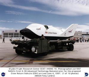 | Keywords: X-38 Arrival at NASA Dryden on June 4, 1997 DVIDS730420.jpg en The actual CRV to be flown in space was expected to be 30 feet long The X-38 project is a joint effort between the Johnson Space Center Houston Texas JSC Langley Research Center Hampton Virginia LaRC and Dryden Flight Research Center Edwards California DFRC with the program office located at JSC A contract was awarded to Scaled Composites Inc Mojave California for construction of the X-38 test airframes The first vehicle was delivered to the JSC in September 1996 The vehicle was fitted with avionics computer systems and other hardware at Johnson A second vehicle was delivered to JSC in December 1996 Flight research with the X-38 at Dryden began with an unpiloted captive-carry flight in which the vehicle remained attached to its future launch vehicle Dryden's B-52 008 There were four captive flights in 1997 and three in 1998 plus the first drop test on March 12 1998 using the parachutes and parafoil Further captive and drop tests occurred in 1999 In March 2000 Vehicle 132 completed its third and final free flight in the highest fastest and longest X-38 flight to date It was released at an altitude of 39 000 feet and flew freely for 45 seconds reaching a speed of over 500 miles per hour before deploying its parachutes for a landing on Rogers Dry Lakebed In the drop tests the X-38 vehicles have been autonomous after airlaunch from the B-52 After they deploy the parafoil they have remained autonomous but there is also a manual mode with controls from the ground NASA's first X-38 Advanced Technology Demonstrator for the proposed Crew Return Vehicle CRV is transported across the ramp after its arrival at NASA's Dryden Flight Research Center Edwards California in June 1997 The vehicle arrived aboard a USAF C-17 transport aircraft from NASA's Johnson Space Center JSC The X-38 Crew Return Vehicle CRV research project is designed to develop the technology for a prototype emergency crew return vehicle or lifeboat for the International Space Station The project is also intended to develop a crew return vehicle design that could be modified for other uses such as a joint U S and international human spacecraft that could be launched on the French Ariane-5 Booster The X-38 project is using available technology and off-the-shelf equipment to significantly decrease development costs Original estimates to develop a capsule-type crew return vehicle were estimated at more than 2 billion X-38 project officials have estimated that development costs for the X-38 concept will be approximately one quarter of the original estimate Off-the-shelf technology is not necessarily old technology Many of the technologies being used in the X-38 project have never before been applied to a human-flight spacecraft For example the X-38 flight computer is commercial equipment currently used in aircraft and the flight software operating system is a commercial system already in use in many aerospace applications The video equipment for the X-38 is existing equipment some of which has already flown on the space shuttle for previous NASA experiments The X-38's primary navigational equipment the Inertial Navigation System/Global Positioning System is a unit already in use on Navy fighters The X-38 electromechanical actuators come from previous joint NASA U S Air Force and U S Navy research and development projects Finally an existing special coating developed by NASA will be used on the X-38 thermal tiles to make them more durable than those used on the space shuttles The X-38 itself was an unpiloted lifting body designed at 80 percent of the size of a projected emergency crew return vehicle for the International Space Station although two later versions were planned at 100 percent of the CRV size The X-38 and the actual CRV are patterned after a lifting-body shape first employed in the Air Force-NASA X-24 lifting-body project in the early to mid-1970s The current vehicle design is base lined with life support supplies for about nine hours of orbital free flight from the space station It's landing will be fully automated with backup systems which allow the crew to control orientation in orbit select a deorbit site and steer the parafoil if necessary The X-38 vehicles designated V131 V132 and V-131R are 28 5 feet long 14 5 feet wide and weigh approximately 16 000 pounds on average The vehicles have a nitrogen-gas-operated attitude control system and a bank of batteries for internal power NASA Identifier NIX-EC97-44096-16 2009-12-09 Glenn Research Center https //www dvidshub net/image/730420 730420 2012-10-17 16 36 WASHINGTON DC US PD-USGov Langley Research Center Images from DoD uploaded by Fæ NASA X-38 |