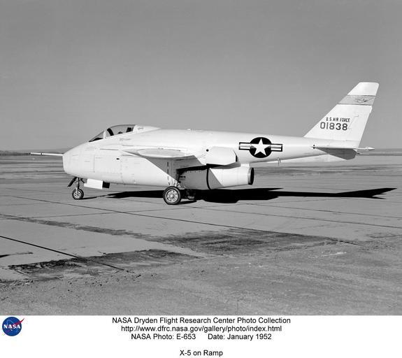 | Keywords: X-5 on Ramp DVIDS692292.jpg en This NACA High-Speed Flight Research Station photograph of the X-5 was taken at the South Base of Edwards Air Force Base in 1952 The photograph is a left side view of the aircraft on the ramp The Bell X-5 was flight tested at the NACA High-Speed Flight Research Station now the NASA Dryden Flight Research Center Edwards California from 1952 to 1955 The X-5 was the first aircraft capable of sweeping its wings in flight It helped provide data about wing-sweep at angles of up to 60 degrees at subsonic and transonic speeds There were two X-5 vehicles Ship 1 was flown at the NACA High-Speed Flight Research Station High-Speed Flight Station as it was redesignated in 1954 from 1951 to 1955 Ship 2 was operated by Bell and the U S Air Force and was lost in a spin accident in 1953 Following the conclusion of the contractor's test program the X-5 was grounded for installation of a NACA instrument package The Air Force conducted a short six-flight evaluation program Since the Air Force evaluation program included data collection it was considered as part of the overall NACA effort and flights were logged as AF/NACA In the NACA test program the X-5 demonstrated severe stall-spin instability The X-5 was also used as a chase plane for other research aircraft because it could vary its flying characteristics to suit the airplane it was chasing Ship 1 flew a total of 133 flights during its three years of service In spite of the problems with the aircraft the X-5 provided a significant full-scale verification of NACA wind-tunnel predictions for reduced drag and improved performance that resulted from this configuration's increasing the wing sweep as the speed of the aircraft approached the speed of sound The X-5 flight tests provided some of the design data for the Air Force F-111 and Navy F-14 tactical aircraft Although the mechanism by which the X-5 changed its wing sweep made this particular design impractical development of a viable variable-sweep aircraft had to await Langley Aeronautical Laboratory's concept of an outboard wing pivot in the mid-1950s Langley was a NACA research laboratory in Hampton Virginia The X-5 was a single seat aircraft powered by an Allison J-35-A-17A jet engine It was 33 33 feet long with a wingspan of 20 9 feet with the wings swept back at an angle of 60 degrees to 33 5 feet with the wings unswept When fully fueled the X-5 weighed 9 875 pounds NASA Identifier NIX-E-653 2009-09-23 Glenn Research Center https //www dvidshub net/image/692292 692292 2012-10-10 12 48 WASHINGTON DC US PD-USGov Aircraft at Edwards Air Force Base Images from DoD uploaded by Fæ Bell X-5 |