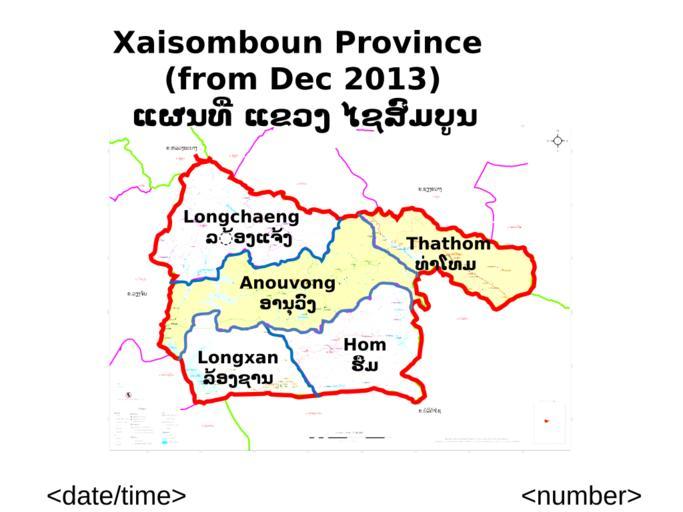 | Keywords: Xaisomboun Province (from Dec 2013). Laos.svg en New map of the Xaisomboun Province following official Laos governement data http //www na gov la/sess_leg7/doc_sess6_leg7/session6_docs/day5/Presentation13 ppt 2013-12-13 own Capiscuas other versions 18 970390720040506 102 54720280621592 cc-zero Maps of Laos Uploaded with UploadWizard |