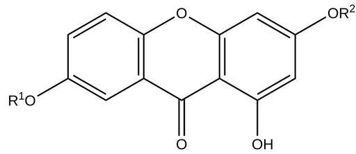 | Keywords: Xanthones-Gentiana.svg misaligned atom labels en Xanthones a selected constituent of Gentiana Created using ChemDraw Ultra 12 gentisin R1 H R2 CH3 isogentisin R1 CH3 R2 H gentisin R1 H R2 primeverosyl 2014-06-19 20 59 36 own Andromeas cc-zero Uploaded with UploadWizard Xanthones Gentiana |