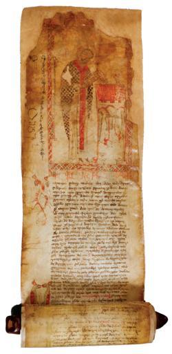 | Keywords: იოანე ოქროპირის ჟამისწირვა XIII-XIV სს. გრაგნილი.png ka XIII-XIV სს გრაგ ილი შემდგარი სამი ერთმა ეთზე გადაკერებული ეტრატის ფურცლის ა უ კეფისაგა აწერია უსხურით ყავისფერი მელ ით სათაური ფერადი საღებავებით ლამაზად მ ხატული საზედა ას ები მთავრულით ადგილები გაცხ ველებულია შავი მელ ით ხელ აწერის გადამწერი ყ ფილა გაბრიელი რ მელსაც უსხურით შეუსრულებია ტექსტი გრაგ ილი აწერია რივე მხარეზე ი ა ე ქრ პირის ჟამისწირვა ა უ კ დაკი დახვეულია ხის ჯ ხზე ა უ კ დაკზე ტექსტის დასაწყისში მ თავსებულია ი ა ე ქრ პირის გამ სახულება რ მელიც ჩასმულია წ ული რ ამე ტით შემკულ ჩარჩ ში XIII-XIV c Archives Archives PD-Art Uploaded with UploadWizard Nuskhuri manuscripts Asomtavruli letter Doni |