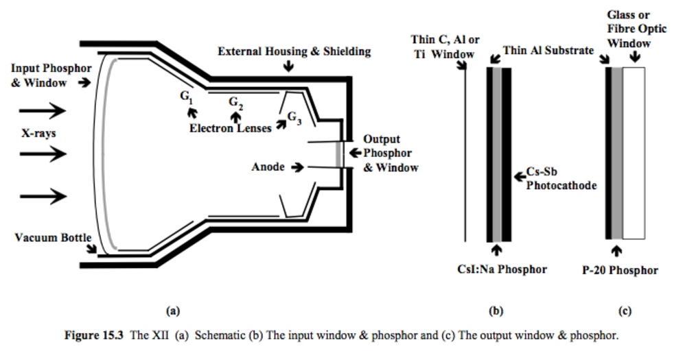 | Keywords: XiiSchematic.jpg en The X-ray image intensifier a with close-ups of the phosphor/photocathode sandwich b and the output phosphor c own Kieranmaher 2001-01-01 Reproduced with permission from Heggie JCP Liddell NA Maher KP 2001 Applied Imaging Technology 4th Edition Physics diagrams |