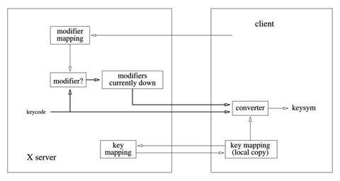 | Keywords: Xkeyboard.svg This is what happends between an X Window Server and a client when a key is pressed the X server starts with a keycode which may be stored as a modifier if this keycode is specified to be a modifier Regardless the keycode goes to the client together with the set of modifiers that are currently down The client can change the modifiers so that the key a acts like a Shift There is also a separate mapping for translating keycode+modifier into a keysym This mapping is stored in the server which however does not use it Clients usually retrieve this mapping for performing the translation 2006-01-11 own assumed Tizio X Window System |