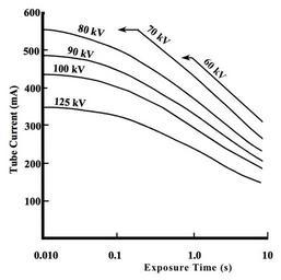 | Keywords: XrtLoadingCurves.jpg en Tube loading curves for an XRT operated at 8 500 rpm and 0 6 mm focal spot own Kieranmaher 2001-01-01 Reproduced with permission from Heggie JCP Liddell NA Maher KP 2001 Applied Imaging Technology 4th Edition Cc-zero Physics diagrams |
