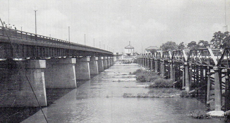 Keywords: Yahagibashi-3.jpg ja 1951年(昭和26年)に架設された新橋(左) 右は旧橋 1966 岡崎市勢要覧 昭和41年版 岡崎市役 1966年7 岡崎市 Okazaki city other versions PD-Japan-organization Okazaki Aichi