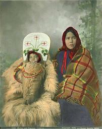 | Keywords: Yakama Indian woman holding infant in cradleboard, Washington, 1899 (LAROCHE 48).jpeg Photograph Creator Frank La Roche Studio portrait of a young Yakama woman and her child She has a blanket over her shoulders and scarf on her head the infant is tightly swaddled in a cradleboard set on a fur-covered chair They are posed in front of a painted backdrop of an arbor Caption on image Mother and papoose Yakima Colored photograph Subjects LCTGM Cradleboards Subjects LCSH Portraits-Washington State ; Yakama Indians--Clothing dress; Yakama Indians--Infants depicted place Washington state 1899 Institution University of Washington UWASH-LAROCHE-source accession number laroche 48 PD-old-auto-1923 1936 Information field Order Number LAR135 Hand-colored photographs of Native Americans |
