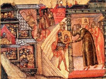 | Keywords: Yakov Lyubsky presenting the icon to Local Headman of Yaroslavl.jpg en Yakov Lyubsky presenting the icon to Local Headman of Yaroslavl ru Яков Любский да ит икону Казанской Богомате и я ославскому земскому ста осте Василию Лыткину Клеймо амы от иконы Богомате и Я ославской-Казанской Конец XVII века Я ославский художественный музей Летопись Я ославля 1010 2010 С-Пб ИД « о ской Пете бу г» 2007 360 с; ил Author Конец XVII века PD-old Russian museum photo Time of Troubles History of Yaroslavl Icons of Yaroslavl Клеймо Icons in Yaroslavl Art Museum Our Lady of Kazan |