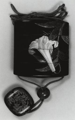 Keywords: Yamada Jokasai - Inro with White Lily - Walters 67411.jpg A black standard oblong three compartment inro On one side a lily in inlaid raden the leaves in takamakie in silver A butterfly in takamakie in gold flying just above the lily A plant with red lacquer leaves in the background Part of the butterfly's wing is at the top of the inro All on a black roiro lacquer ground Another lily on the reverse whose leaves circle around to the other side The cord channels are internal The interior in fundame of gold middle Other date century 19 Edo lacquer shell bead with enamel inro cm 7 7 7 2 3 accession number 67 411 33278 William T / Henry Walters Collection Baltimore date and mode of acquisition unknown Walters Art Museum Henry Walters Acquired by William T or Henry Walters Signature Jokasai none place of origin Edo present-day Tokyo Japan Walters Art Museum license Inro in the Walters Art Museum Yamada Jokasai Flowers in art |