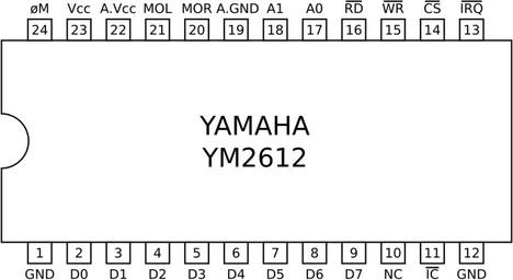 | Keywords: Yamaha YM2612 pinout.svg Pinout of the Yamaha YM2612 IC chip Adobe Illustrator Valid SVG File Yamaha YM2612 pinout gif 2010-04-16 Original User Ben Boldt / Vector Fred the Oyster File Yamaha YM2612 pinout gif Electronic components Images created by Fred the Oyster |