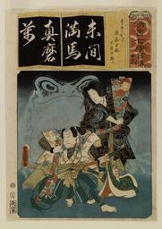 | Keywords: Yamamotoya Heikichi, Eikyudo - Seisho nana i-ro-ha - Walters 95130.jpg The actors Nakamura Fukusuke I and Iwai Kumesaburō III from left as Ota Tarō and Takiyasha-hime The wicked Princess Takiyasha is shown in this print invoking toad magic in her attempt to overcome her enemy the hero Mitsukuni According to legend Princess Takiyasha was the daughter of Taira no Masakado an evil magician and unsuccessful usurper of the throne who died in the year 940 After her father's death Takiyasha encountered Nikushisen the spirit of a toad whose witchcraft abetted her in fomenting a rebellion However the emperor's defender Mitsukuni courageously withstood the power of Takiyasha's magic thus quelling her ambitions 1856-08 late Edo pigments mulberry paper cm 35 5 25 2 accession number 95 130 40117 Justine Lewis Keidel date and mode of acquisition unknown Walters Art Museum Gift of Justine Lewis Keidel 1986 Signature Toyokuni ga place of origin Japan 006-0837 Walters Art Museum license 2D Japanese prints in the Walters Art Museum Media contributed by the Walters Art Museum needs category review Utagawa Kunisada |