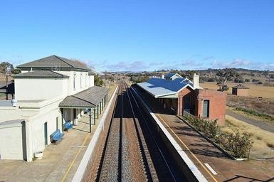 Keywords: 34 49S 148 55E Yass Junction railway station is located on the Main South line in New South Wales, Australia. It serves the town of Yass. Opened 3 July 1876. attribution: Mattinbgn