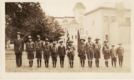 | Keywords: 1920s children scouts uniforms post office postoffice town hall townhall monochrome Scout troupe and leader, lined up in the park in the centre of Deseronto, Ontario. Behind them is the Town Hall (at the time, the Bank of Montreal) and the Post Office. Probably taken on the day of the unveiling of the Deseronto war memorial: September 3, 1923. Scout troupe and leader, lined up in the park in the centre of Deseronto, Ontario. Behind them is the Town Hall (at the time, the Bank of Montreal) and the Post Office. Probably taken on the day of the unveiling of the Deseronto war memorial: September 3, 1923. |
