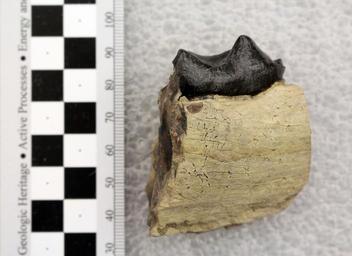 | Keywords: YELL_134174 (1) and (2): Picture shows the second molar of a brontothere that was discovered in Yellowstone National Park in the late 1990s. The tooth is the black-colored part, while the jaw bone is the gray to white fragment. Collecting any natural resources, including rocks and fossils, is illegal in Yellowstone. Photo by Megan Norr; March 2016; Catalog #20804d; Original #YELL_134174(2) YELL_134174 (1) and (2): Picture shows the second molar of a brontothere that was discovered in Yellowstone National Park in the late 1990s. The tooth is the black-colored part, while the jaw bone is the gray to white fragment. Collecting any natural resources, including rocks and fossils, is illegal in Yellowstone. Photo by Megan Norr; March 2016; Catalog #20804d; Original #YELL_134174(2) |