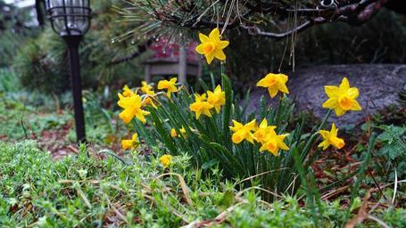 Keywords: daffodils garden park outdoor blossoming natural greenery floral flower sunny pseudonarcis bluer petals pollen bouquet fresh nature flowerbed