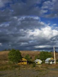 Keywords: yellow wooden shed building thunderstorm dark clouds weather landscape chilcotin cariboo british columbia canada scenery