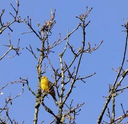 Keywords: yellowhammer bird treetop blue sky