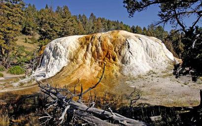 Keywords: yellowstone national park orange spring mound sediment minerals sky clouds trees nature outside country countryside fall autumn