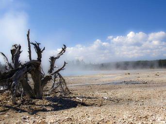 Keywords: yellowstone national park wyoming usa landscape scenery tourist attraction erosion geyser nature volcanic minerals water steam volcanism hot geothermal colorful dead tree dry wood stump