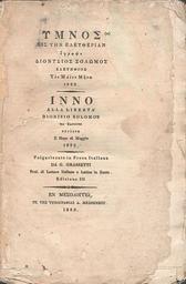 | Keywords: Ymnos Eis Tin Eleftherian.Book cover.1825.jpg en Cover of Dionysios Solomos' Hymn to Liberty μνος εἰς τὴν Ἐλευθερίαν published in Missolonghi Mεσολόγγι in 1825 First Greek edition from the press of Dimitrios Mestheneus «Ἐκ τῆς Τυ ογραφίας Δημητρίου εσθενέως» el Το εξώφυλλο της δεύτερης έκδοσης ρώτη ελληνική έκδοση του μνου εἰς τὴν Ἐλευθερίαν του Διονυσίου Σολωμού Τυ ώθηκε στο εσολόγγι «ἐκ τῆς Τυ ογραφίας Δημητρίου εσθενέως» 1825 www vergosauctions gr Dionysios Solomos Custom license marker 2012 09 02 PD-old-100 PD-US Uploaded with UploadWizard Book covers from Greece 1825 book covers Dionysios Solomos |