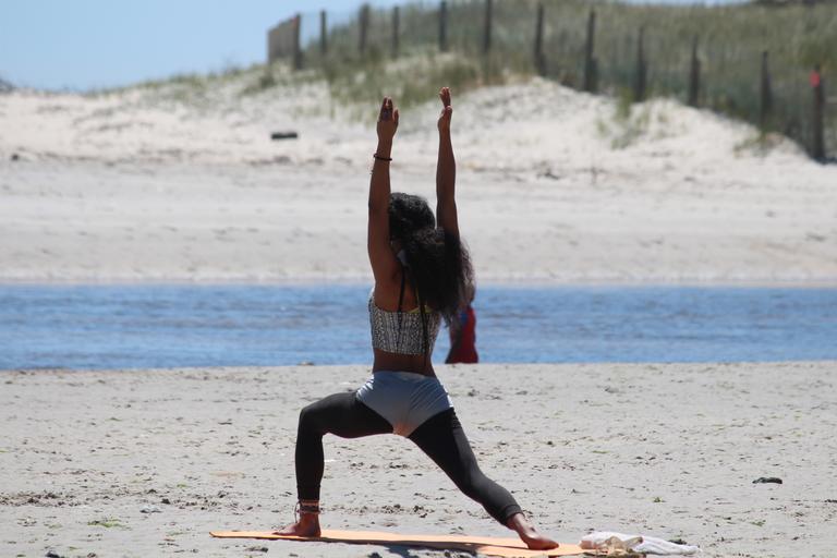 Keywords: yoga woman beach relaxation sand sporty beautiful
