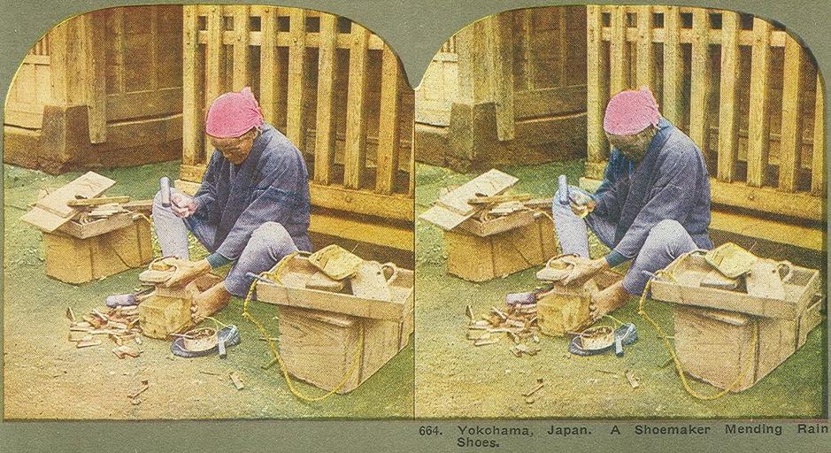 MAKE A MEME View Large Image YokohamaShoemaker.jpg Yokohama Japan A Shoemaker Mending Rain Shoes Scanned from period stereo view card c 1900 No listing of publisher date nor any assertion of copyright Text on reverse YOKOHAMA JAPAN A SHOEMAKER MENDING RAIN SHOES This ...