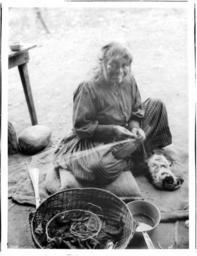 Photograph of a Yokut Indian woman basket maker, Tule River Reservation near Porterville, California, ca.1900. She sits in a half-crouch on a half-filled sack on the ground outside. Basket making supplies sit in a large round basket in front of her. A dead small furry rodent (a marmot?) lays on the ground at her left from which she appears to be drawing the viscera or intestine for use in basket making. Part of a wooden table is visible behind her.