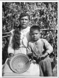 Photograph of a Yokut Indian women basket maker and her son home from school, Tule River Reservation near Porterville, California, ca.1900. She is sitting, at left, displaying a shallow basket in her lap. He stands next to her, at right, leaning into the crook of her left arm. Foliage is visible behind them.