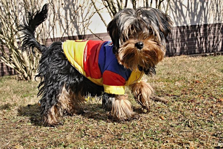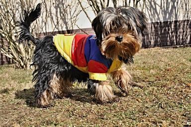 Keywords: yorkshire dog pets puppies ball outfit garden shrubs