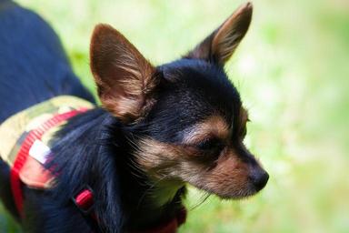 Keywords: yorkshire terrier hybrid chihuahua cute black brown ear face view grass meadow animal animal portrait dog animal world pet fur head curious portrait mammal leash saddle