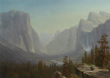 | Keywords: Yosemite by Albert Bierstadt, c1875.jpg ~ 1875 Oil on canvas in 20 28 place of discovery object history exhibition history credit line signed A Bierstadt lower right Inspired by the spectacular and unspoiled wilderness he encountered in the American West Albert Bierstadt set out to record the landscape for posterity focusing on the natural wonders of the largely unexplored and undocumented territories of Yosemite the High Sierras and Yellowstone He was among the first American painters to capture the grandeur and natural splendor of the region and to record the many atmospheric moods of its climate and terrain Upon first casting eye over Yosemite Valley in 1863 Bierstadt proclaimed We are now here in the garden of Eden I call it The most magnificent place I was ever in and I employ every moment painting from nature quoted in Eleanor Jones Harvey The Civil War and American Art Washington D C 2012 p 62 The interpretation of the divine spirit Bierstadt found in the mountain valleys of the western panorama characterized the depictions of Yosemite he produced thereafter and he completed his first large-scale rendering in 1865 Looking Down Yosemite Valley California Birmingham Museum of Art Birmingham Alabama He would continue to take the dramatic topography as a subject for years to come becoming more closely associated with the place than perhaps any other artist Painted circa 1875 Yosemite Valley brilliantly captures the monumentality and majesty of the place on an intimate scale Bierstadt would travel to Yosemite twice more in 1872 and 1873 and Gordon Hendricks comments on the fervid stimulation Bierstadt drew from the remote location In Yosemite the artist made studies for some of his most attractive inspired works ABierstadt Fort Worth Texas 1972 p 19 Yosemite Valley superbly demonstrates Bierstadt ™s translation of the Hudson River School formula to the rugged verticality of the West The high vantage point crystalline quality of light and tranquility of the scene are reminiscent of Sanford Robinson Gifford ™s A Gorge in the Mountains Kauterskill Clove 1863 The Metropolitan Museum of Art New York Yet the rugged topography sets Yosemite Valley apart from the eastern landscapes of Bierstadt ™s peers and reveals a different type of sublime In the present work the viewer is overcome by a sense of discovery as the West appears to be opening itself up the river leading the eye back into the scene through the valley past El Capitan on the left and Cathedral Rocks on the right beyond the spray of Bridalveil Fall to the distant snowy peak of Half Dome It is as if one has stumbled upon a hidden valley “a pristine paradise The composition gives the viewer the sense of having entered into hallowed ground a sacred space where nature is all powerful Here man represented by the lone figure painting on a rocky outcropping is overwhelmed by yet at peace with nature This painting also contains a rare self-portrait by Bierstadt who painted as such under an umbrella from the time he was a student in Düsseldorf in the 1850s Bierstadt set out to record the American landscape focusing on the natural wonders of these largely unexplored and undocumented regions His idealized interpretations of the West were in keeping with the image of the frontier held by many who would never travel there and his paintings were highly sought-after by patrons willing to pay record prices for his spectacular canvases Bierstadt ™s paintings of Yosemite held out the promise of a New Eden a place in which all Americans could slough off the trauma of war and sectarian strife a place of renewal and healing Eleanor Jones Harvey The Civil War and American Art Washington D C 2012 p 60 The present work was most likely owned by Ulysses S Grant the famed general who led the Union troops to victory during the Civil War and became the 18th president of the United States in 1869 Grant and Bierstadt knew one another as earlier as 1877 and are known to have dined together at Delmonico ™s restaurant in 1881 It is appropriate that Grant who in 1872 signed the bill to create the world ™s first national park “ Yellowstone “ would own such a majestic view of Yosemite accession number place of creation http //www sothebys com/en/auctions/ecatalogue/2016/american-art-n09580/lot 55 html Sotheby's PD-old-100 Albert Bierstadt Paintings of Yosemite by Albert Bierstadt |