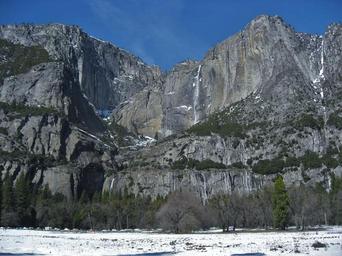 Keywords: yosemite waterfall snow snowmelt water spray blue sky mountain wall rock rock wall valley landscape sky california national park united states of america